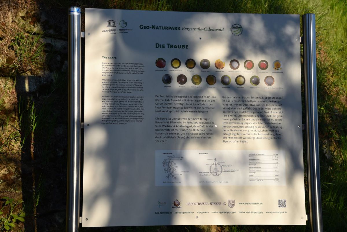 Der Fruchtstand der Rebe ist eine Rispe mit ca. 80-120 Beeren. Jede Beere ist mit einem eigenen Stiel am Gerüst (Kamm) befestigt, der sich am Ende in den kegelförmigen Fruchtboden weitet.